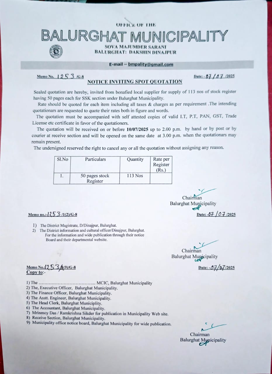 NIQ No. 3951/G-8 Date. 09.02.2026 Regarding Supply of Printing Articles under Balurghat Municipality.
